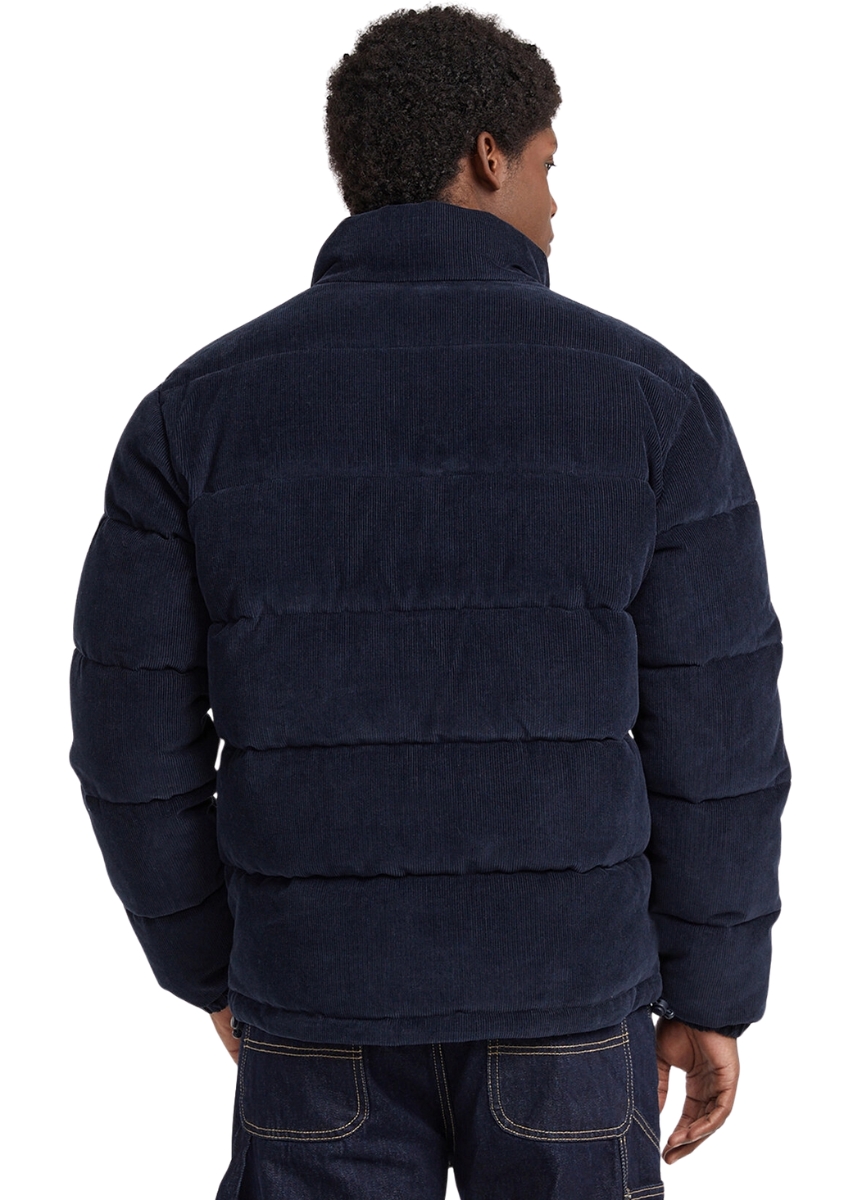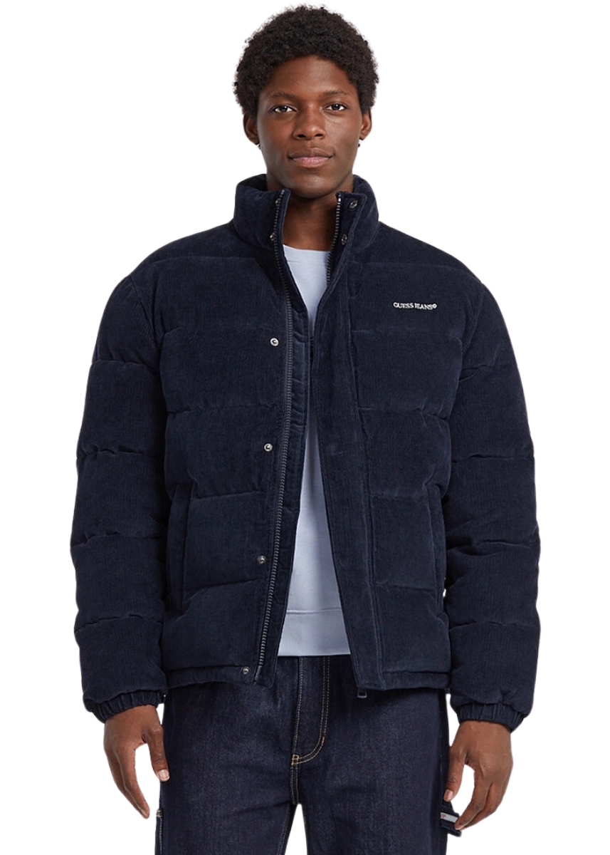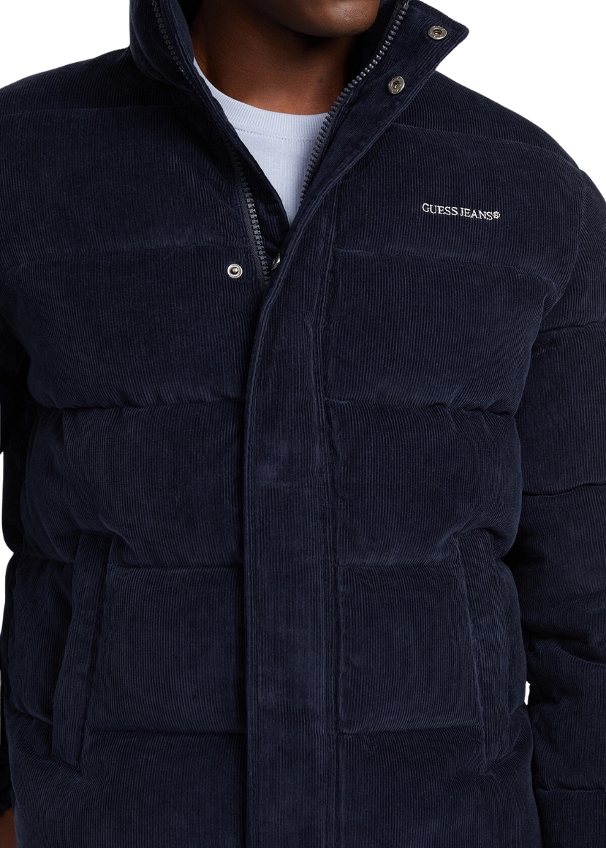 Ανδρικό puffer κοτλέ μπουφάν GUESS JEANS με logo στο στήθος, ψηλό λαιμό και πλευρικές τσέπες με φερμουάρ.