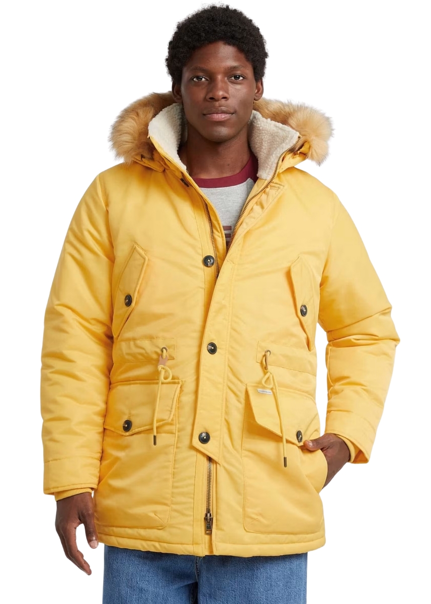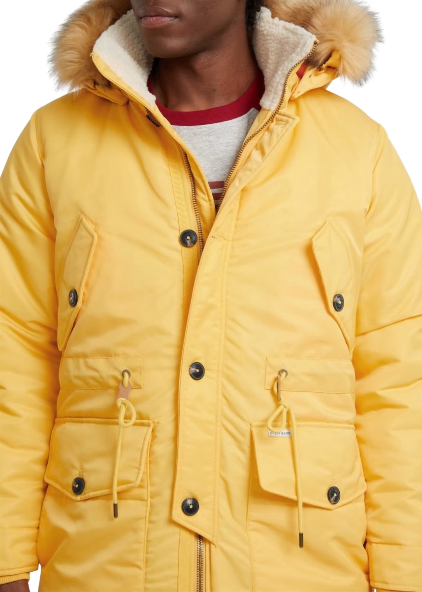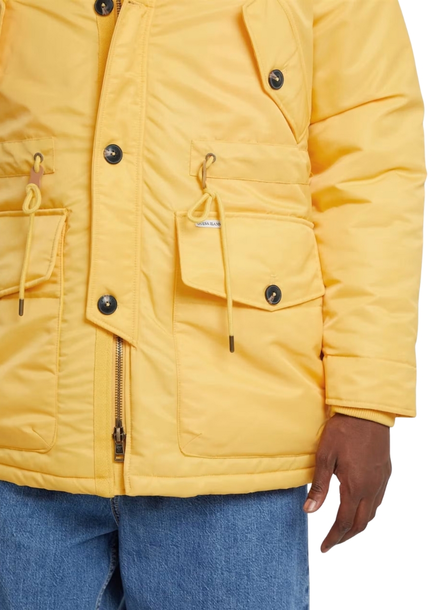 Ανδρικό μίντι παρκά μπουφάν GUESS JEANS με αποσπώμενη κουκούλα, ψηλό λαιμό, τσέπες στο στήθος και μπροστινές τσέπες με καπάκι.