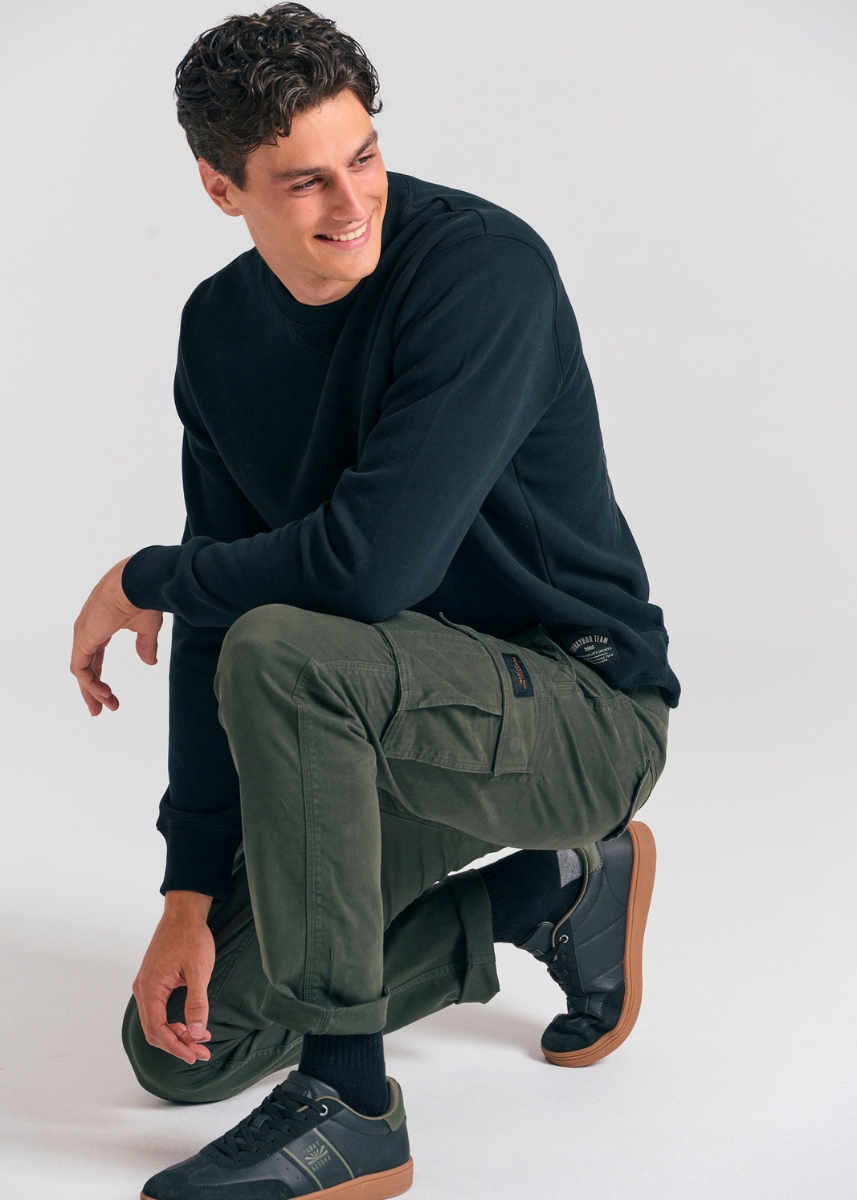 Μονόχρωμο ανδρικό cargo παντελόνι FUNKY BUDDHA σε ίσια εφαρμογή με στενή γραμμή, ιδανικό για όλες τις εποχές – από φθινόπωρο και χειμώνα μέχρι άνοιξη και καλοκαίρι. Κατασκευασμένο από βαμβάκι με φυσικές ίνες, προσφέρει άνεση και σύγχρονο streetwear χαρακτήρα. Η μέση μέτριου ύψους με θηλιές για ζώνη, το κλείσιμο με κουμπιά και φερμουάρ και η λεία ματ υφή ενισχύουν τον minimal σχεδιασμό του. Συνδυάστε το με ένα casual τοπ ή φούτερ και αθλητικά sneakers για μια άνετη εμφάνιση, ιδανική για την πόλη ή τις υπαίθριες δραστηριότητες.