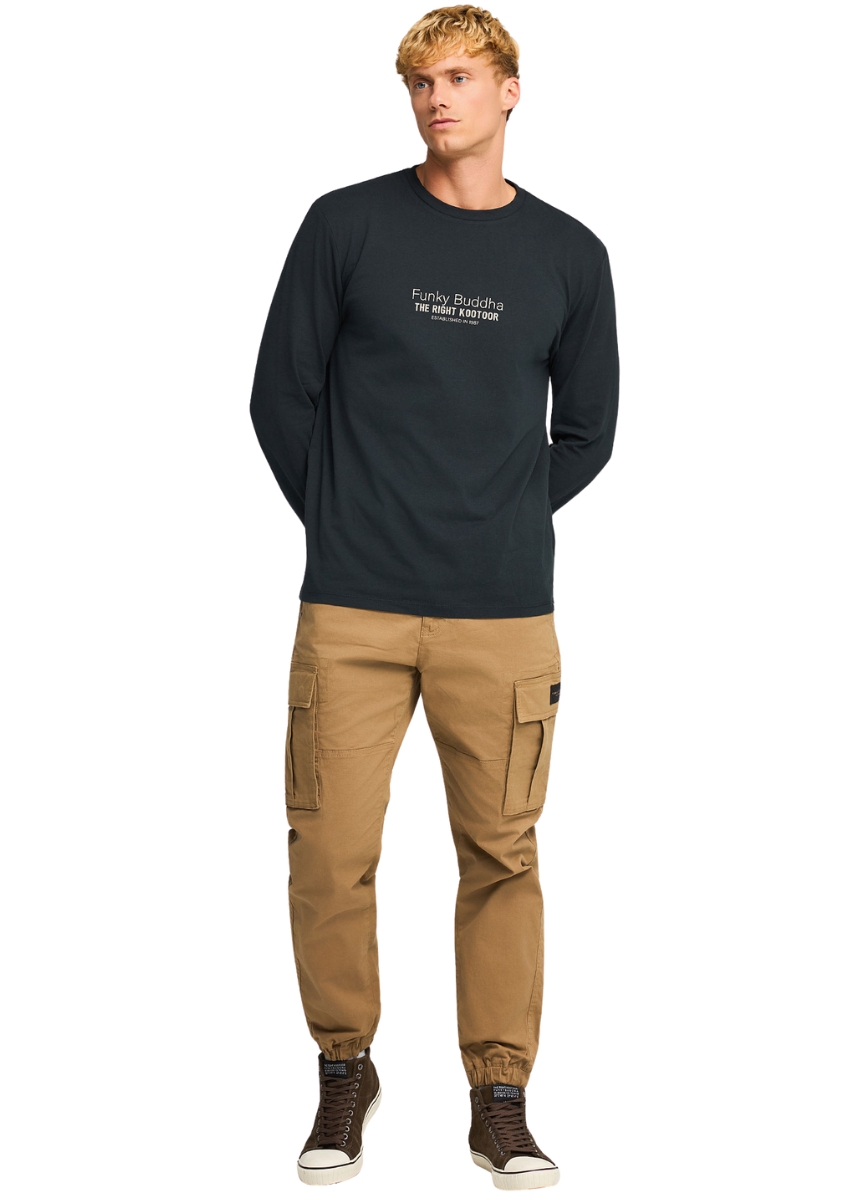 Cargo ανδρικό παντελόνι FUNKY BUDDHA σε μονόχρωμο στυλ, με κανονική εφαρμογή και στενό πόδι μέχρι τον αστράγαλο. Κατασκευασμένο από βαμβακερό μείγμα με ματ υφή, προσφέρει άνεση και κομψότητα. Διαθέτει κλείσιμο με κουμπί και φερμουάρ, λάστιχο στο τελείωμα, τσέπες welt και πρακτική τσέπη cargo, μαζί με πινακίδα λογότυπου για διακριτική στυλιστική πινελιά. Ιδανικό για καθημερινές ή πιο εκλεπτυσμένες εμφανίσεις φθινοπώρου και χειμώνα. Συνδυάστε με μάλλινο πουλόβερ και δερμάτινες μπότες για ένα κλασικό και σύγχρονο look.