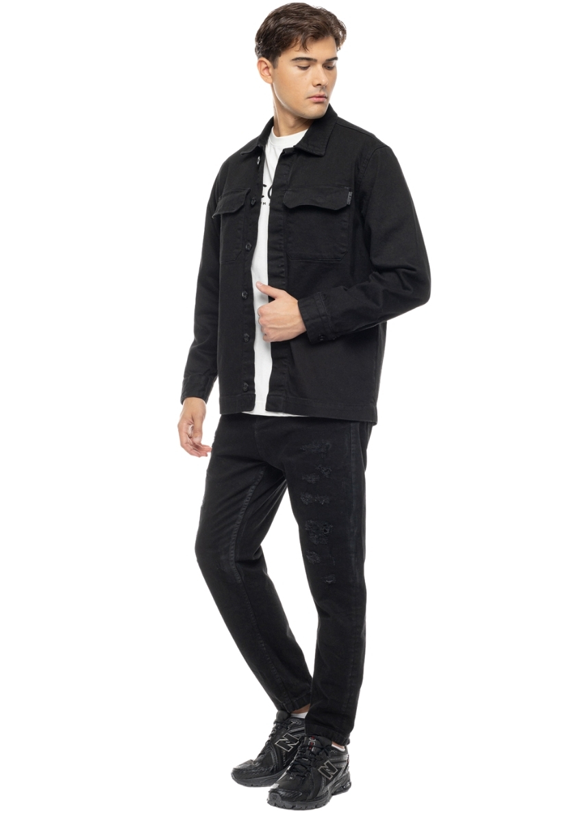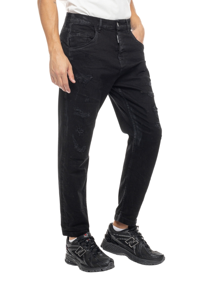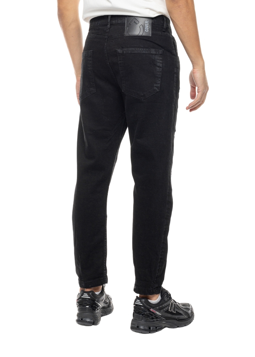 Ανδρικό cropped τζιν COVER σε μαύρο χρώμα με φθορές μπροστά. Διαθέτει ραμμένη ετικέτα με το logo στο πίσω μέρος.