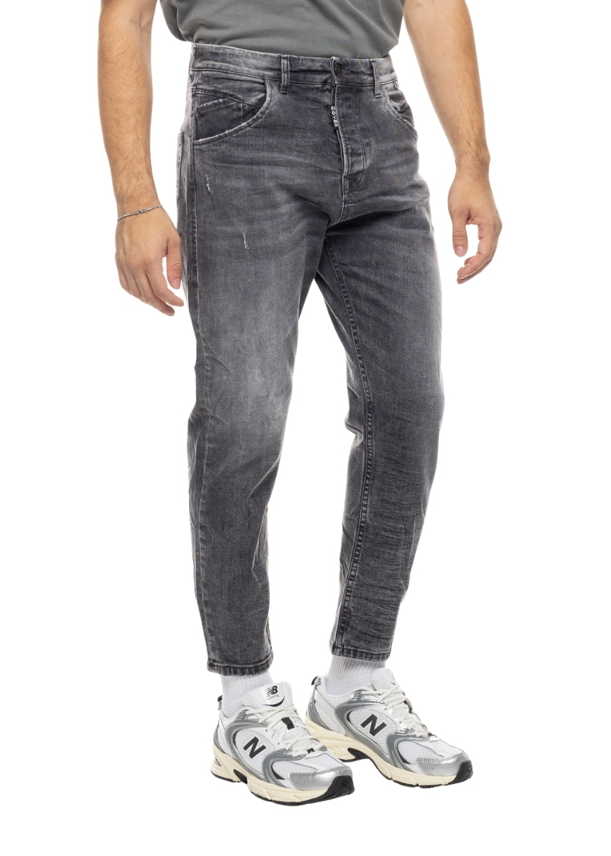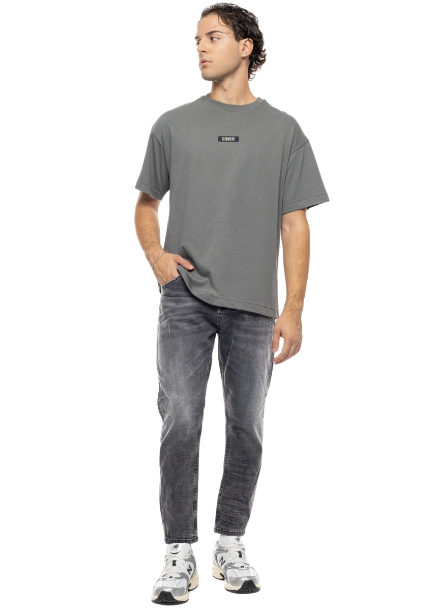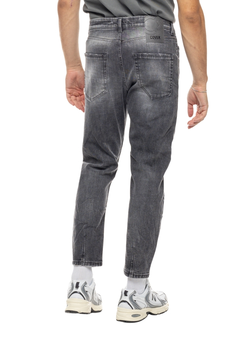 Ανδρικό cropped τζιν COVER σε γκρι χρώμα με ξέβαμμα και μικρές φθορές μπροστά. Διαθέτει ραμμένη ετικέτα με το logo στο πίσω μέρος.