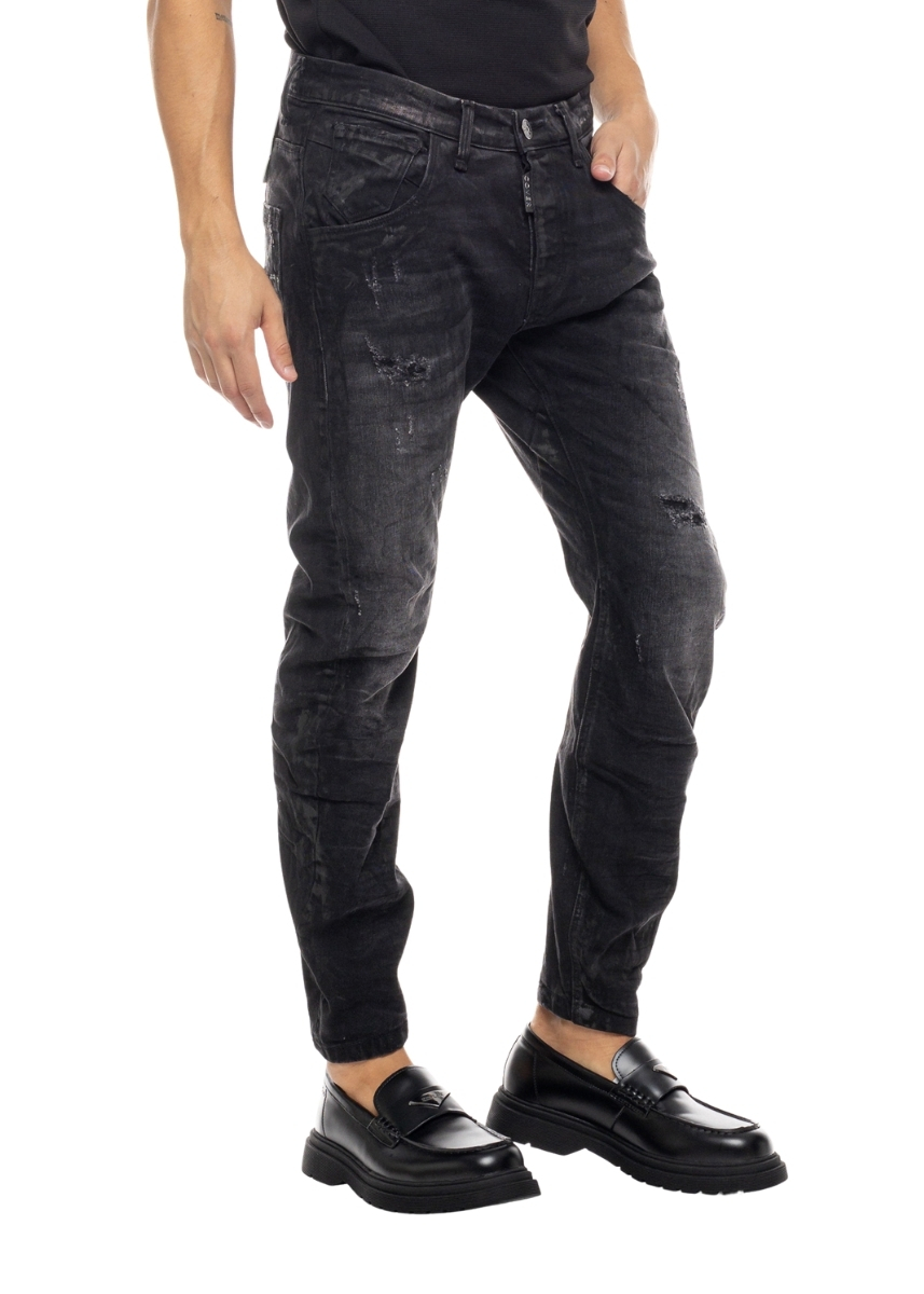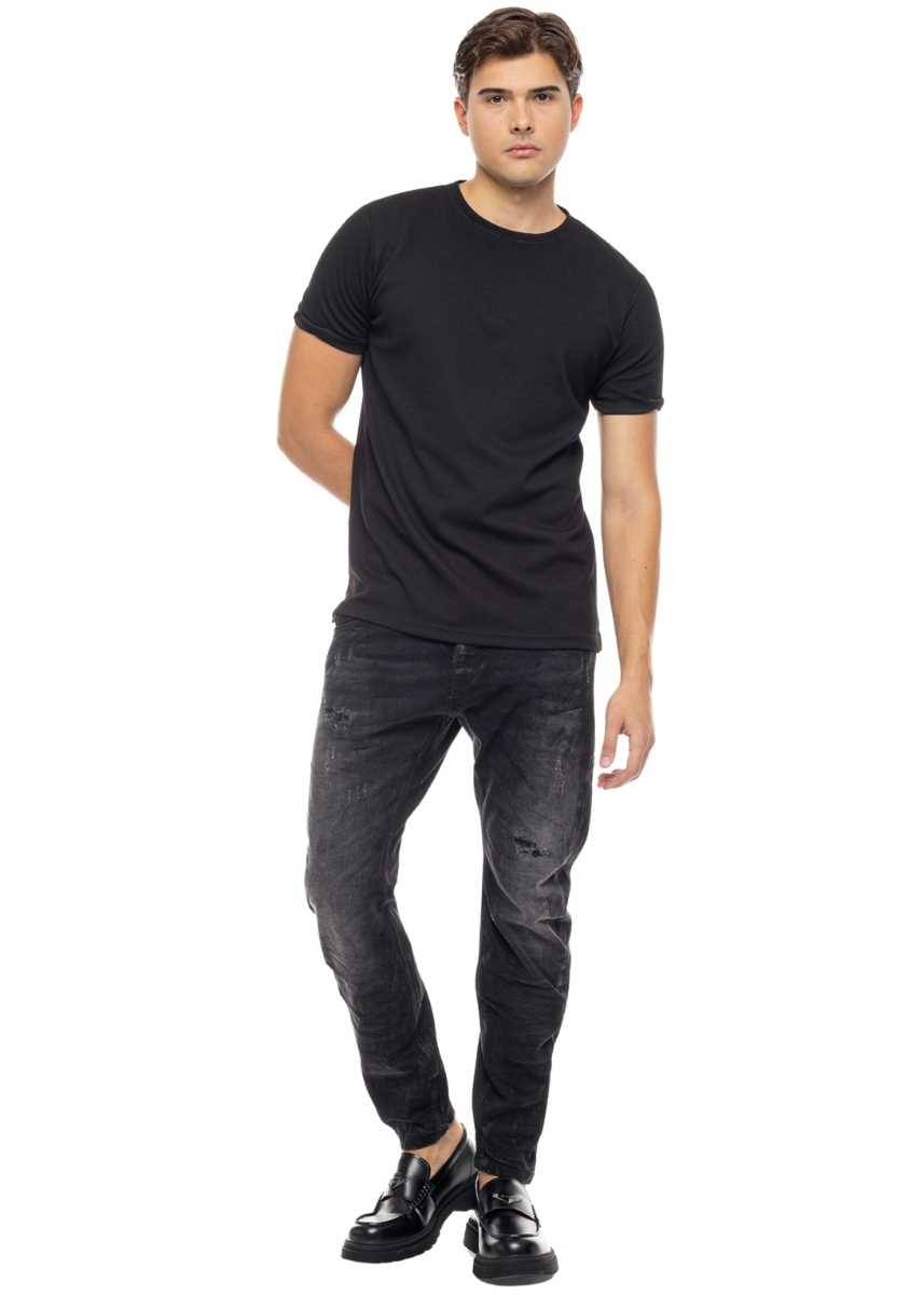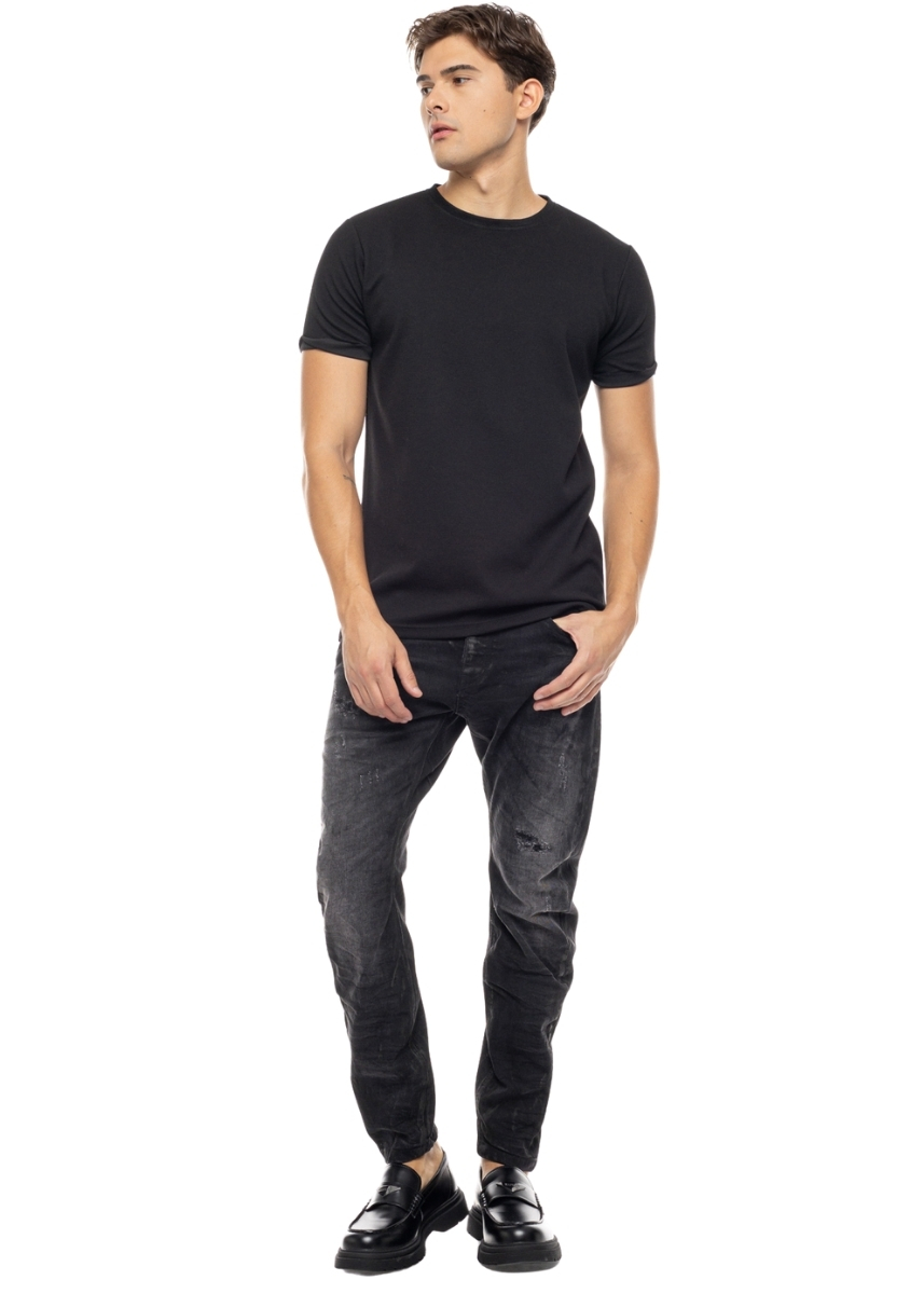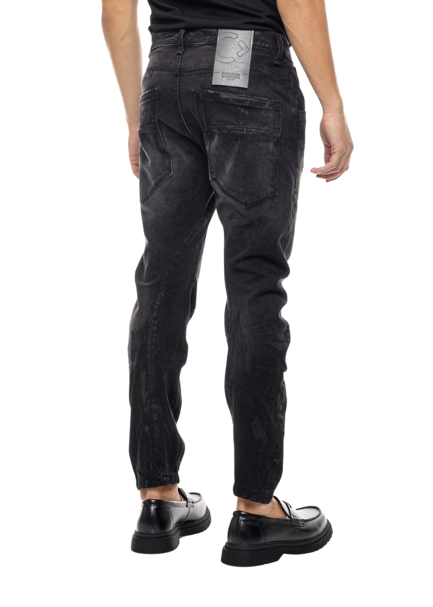 Ανδρικό τζιν Cover Denim σε μαύρο χρώμα με φθορές και ξέβαμμα μπροστά. Διαθέτει ραμμένη ετικέτα με το logo στο πίσω μέρος.