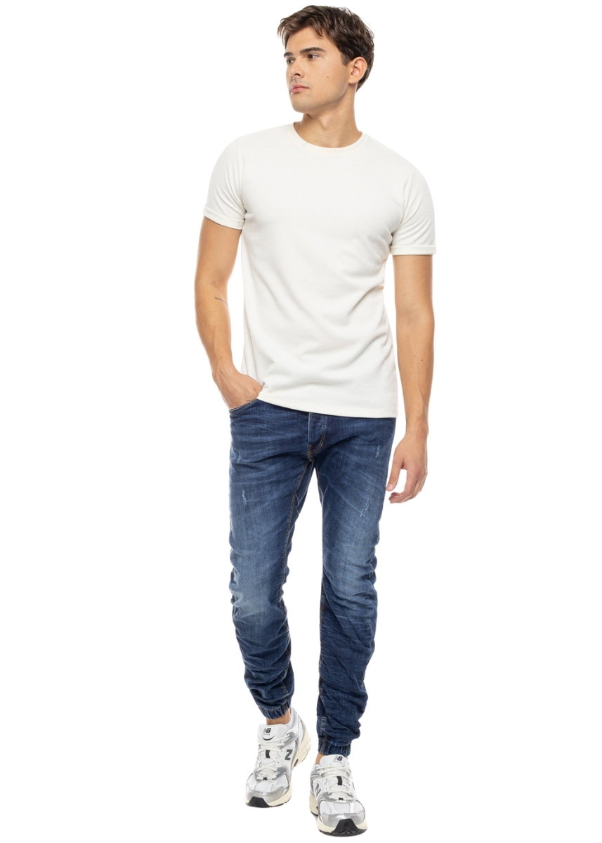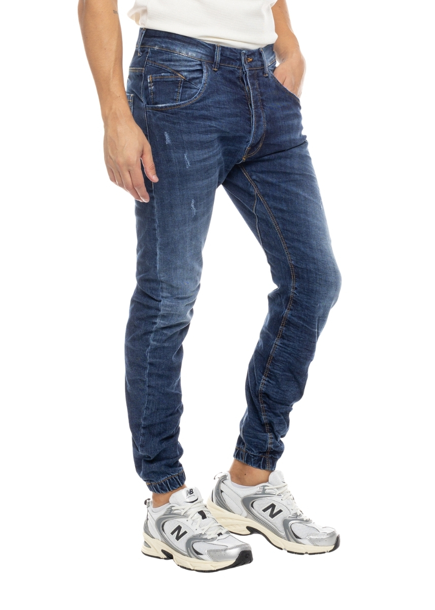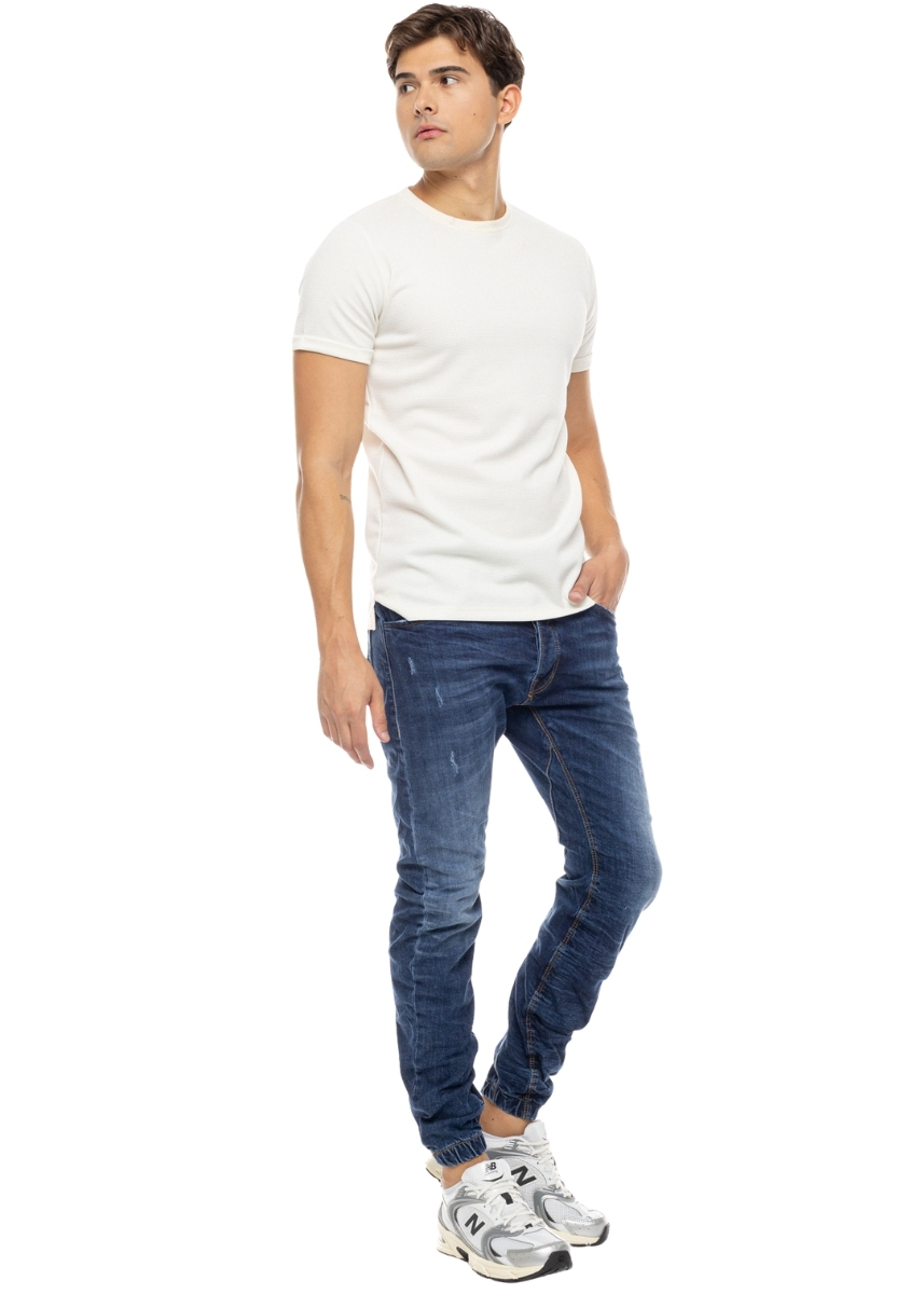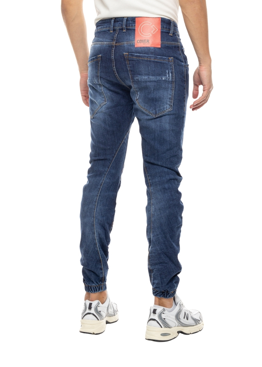 Ανδρικό τζιν Cover Denim με μικρές φθορές μπροστά και λάστιχο στο τελείωμα. Διαθέτει ραμμένη ετικέτα με το logo στο πίσω μέρος.