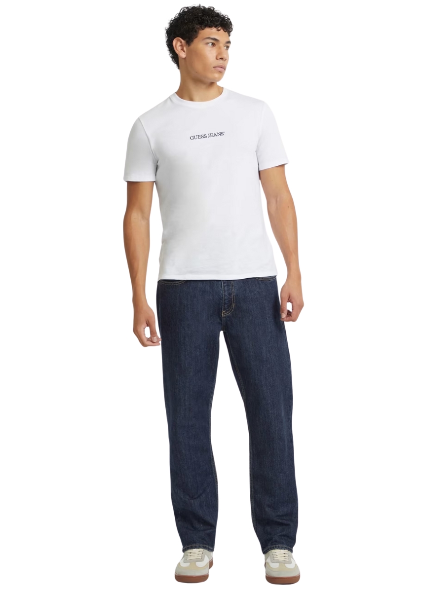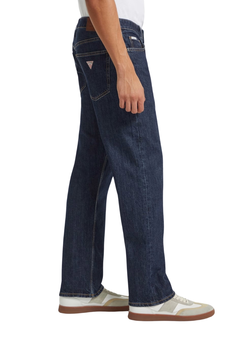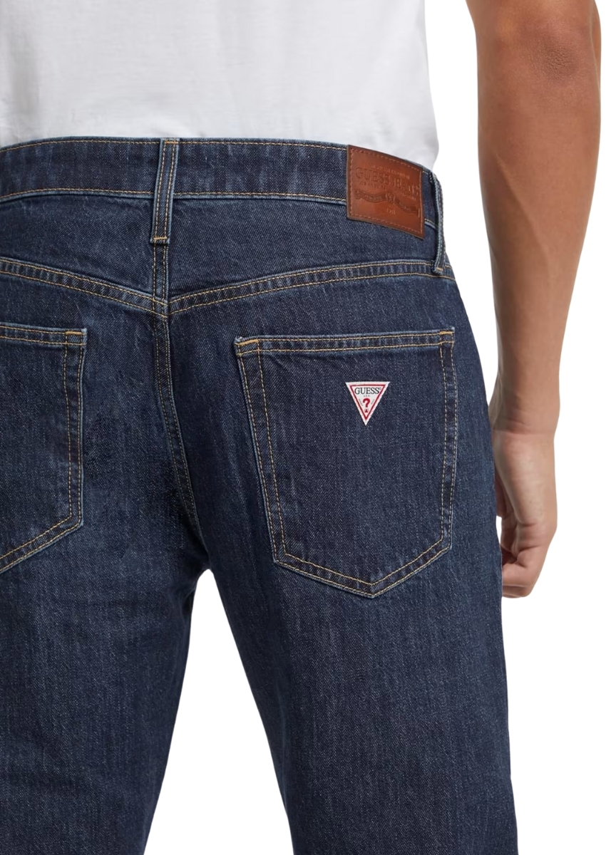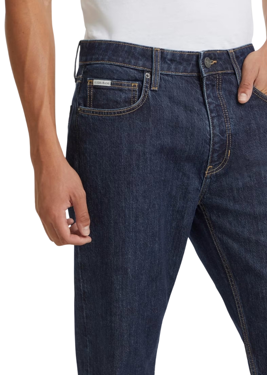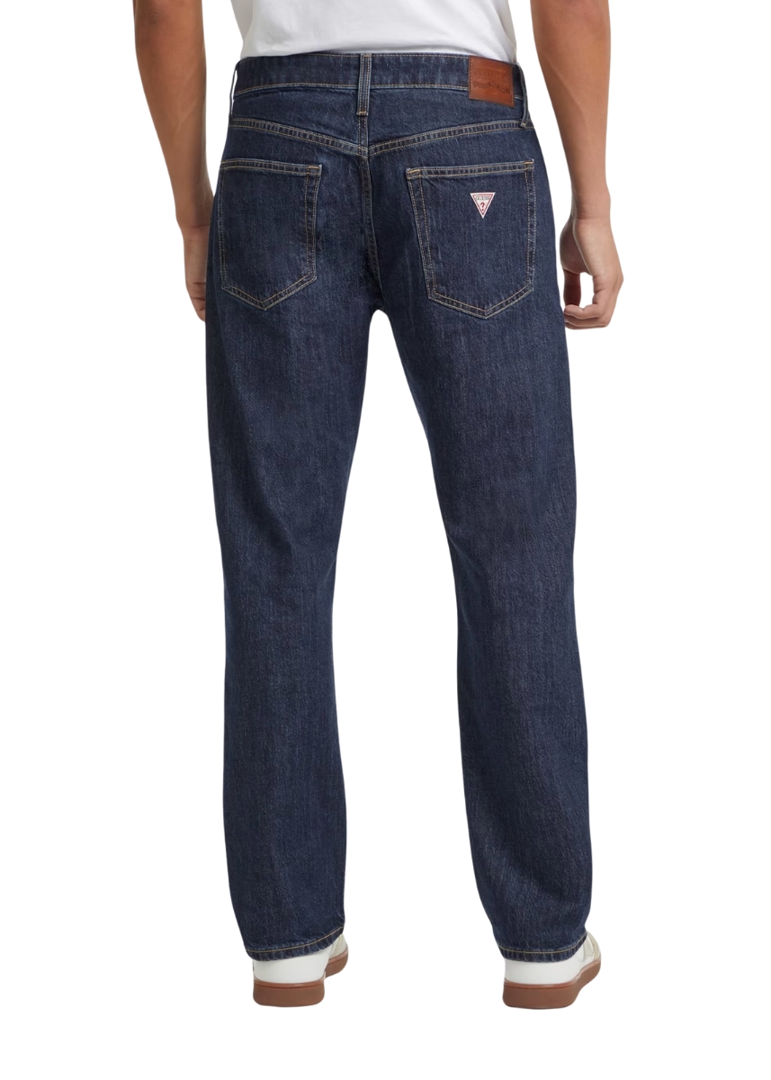 Ανδρικό τζιν Guess Jeans σε straight γραμμή σε μπλε χρώμα για casual εμφανίσεις. Διαθέτει ραμμένη δερμάτινη ετικέτα με το logo στο πίσω μέρος.