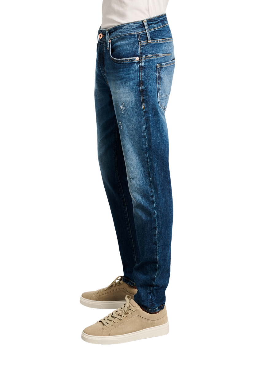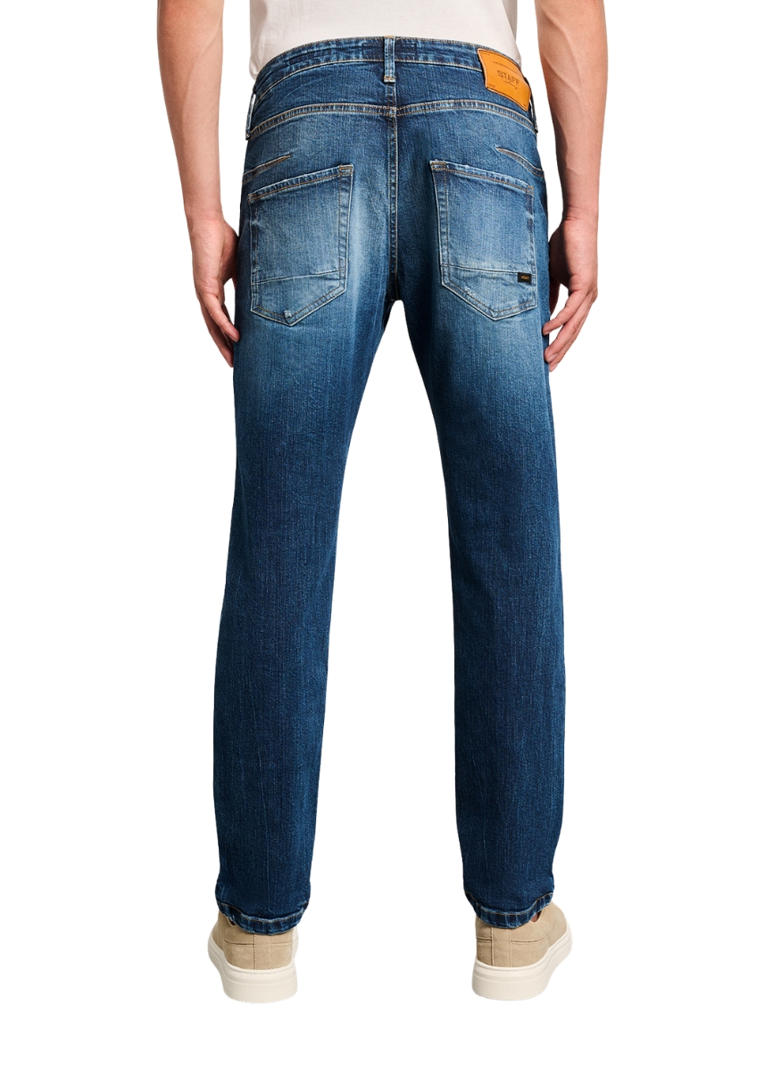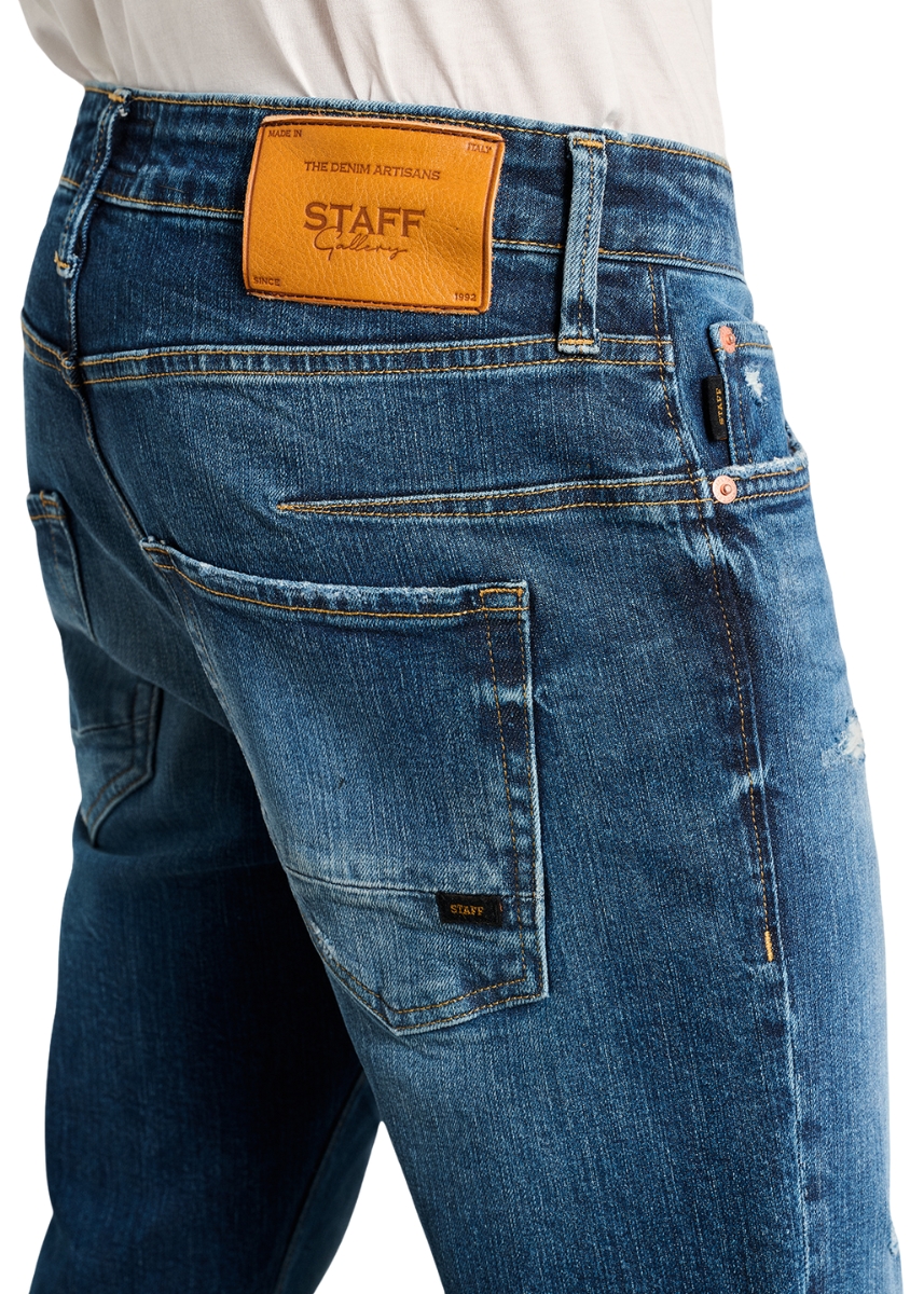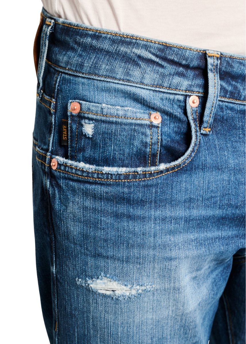 Ανδρικό τζιν παντελόνι Staff σε μπλε χρώμα με ξέβαμμα και μικρές φθορές μπροστά. Διαθέτει ραμμένη δερμάτινη ετικέτα στο πίσω μέρος.