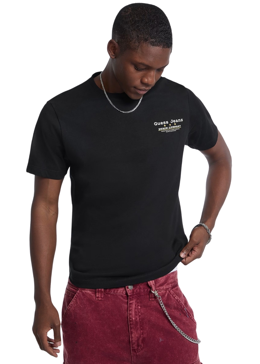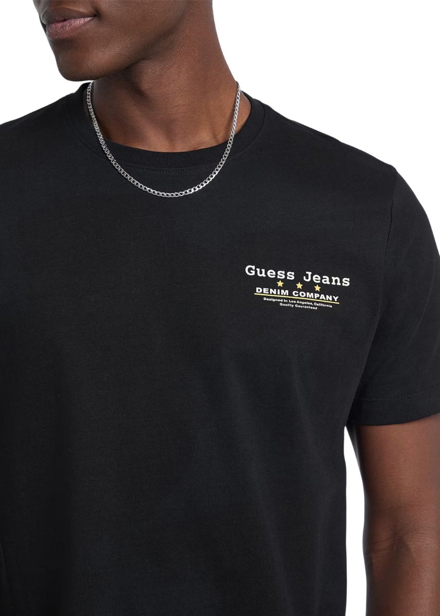 Ανδρικό t-shirt GUESS JEANS με στάμπα στο στήθος και στην πλάτη. Διαθέτει ριμπ στρογγυλή λαιμόκοψη.