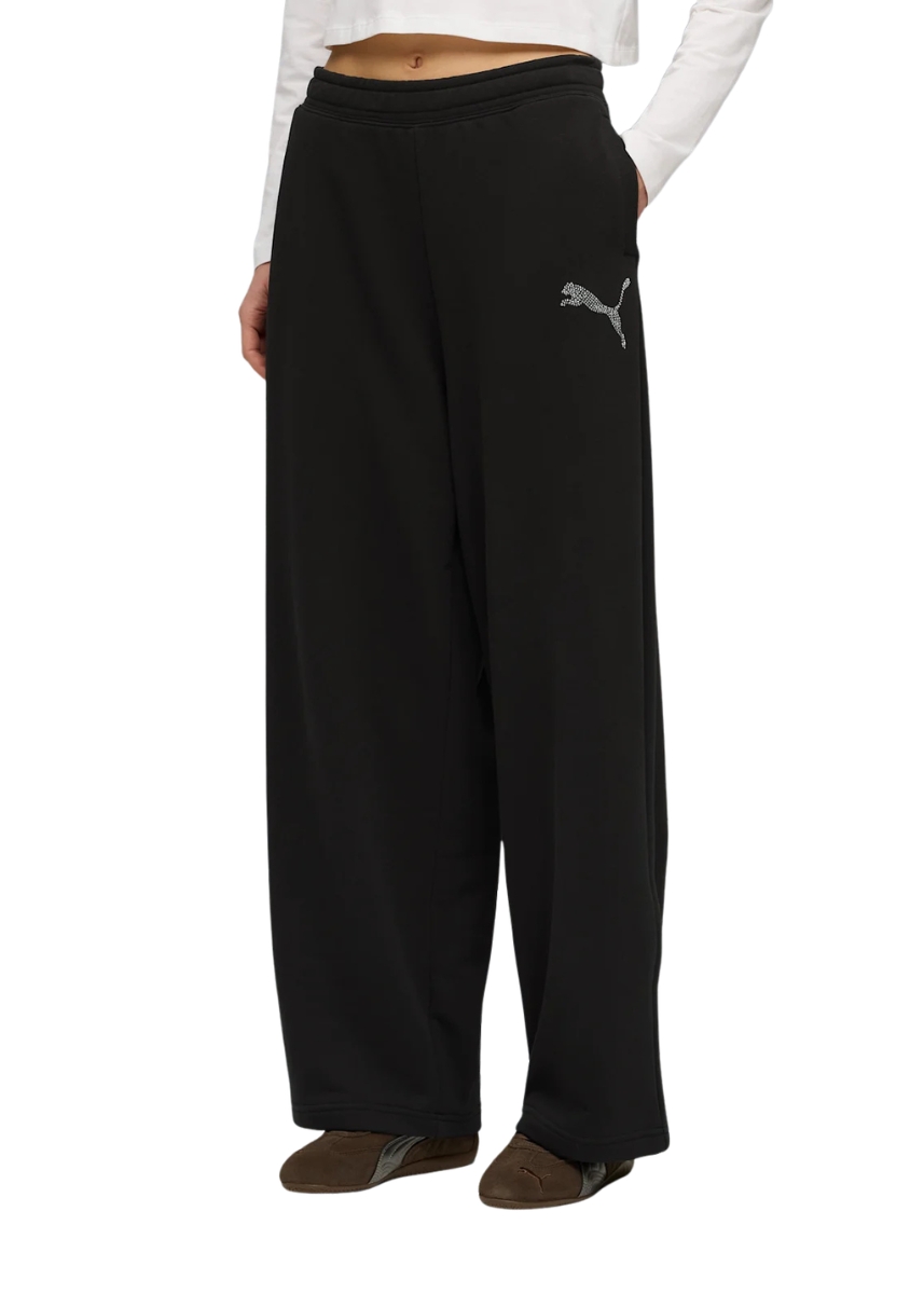 Γυναικείο παντελόνι φόρμας Puma σε oversized fit με logo στο αριστερό πόδι από strass και λεπτομέρεια με straas στο πίσω μέρος του ποδιού. Είναι κατασκευασμένο από premium ύφασμα, ανάλαφρο που προσδίδει μοναδική αίσθηση άνεσης.