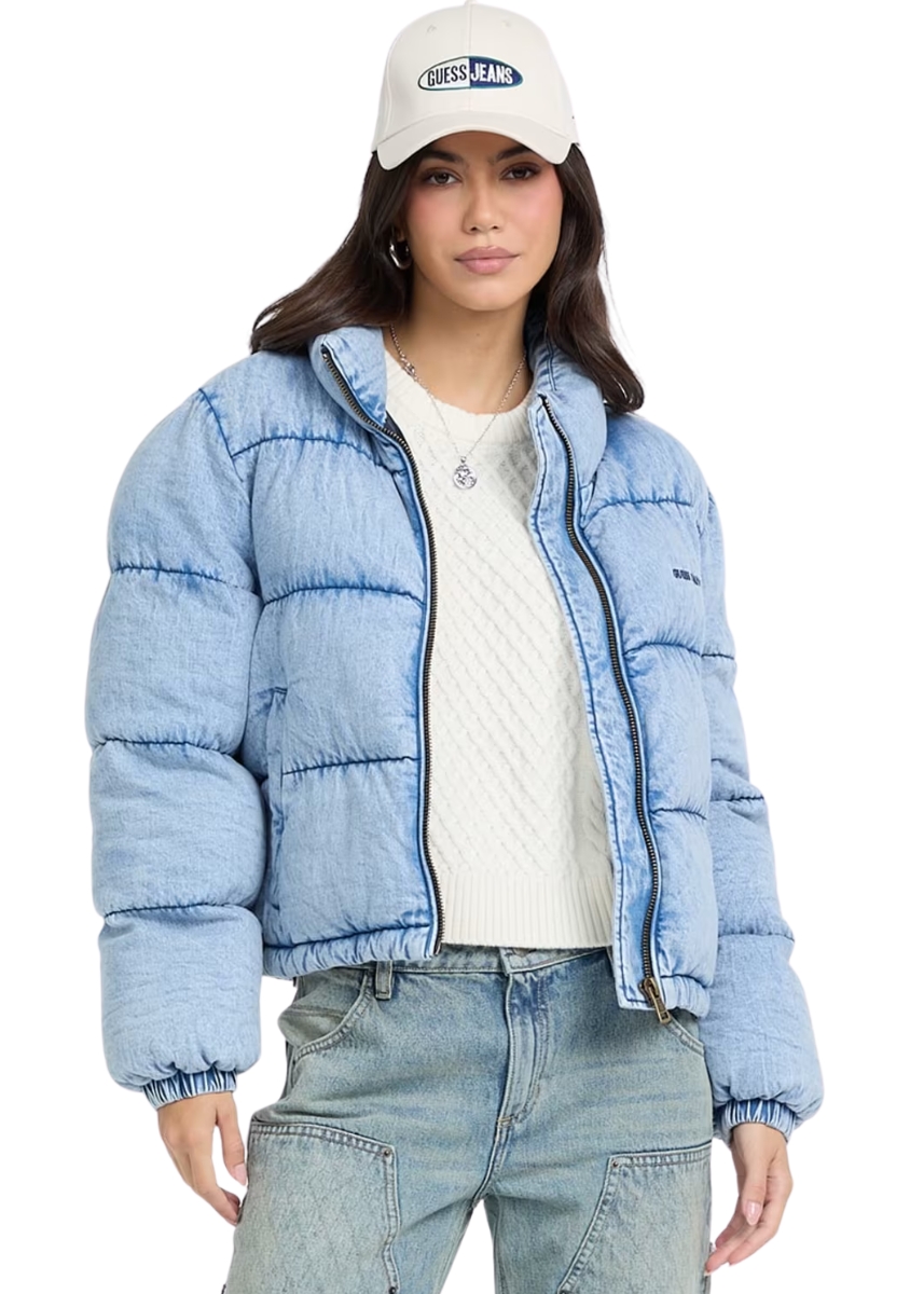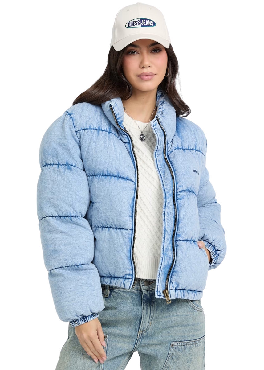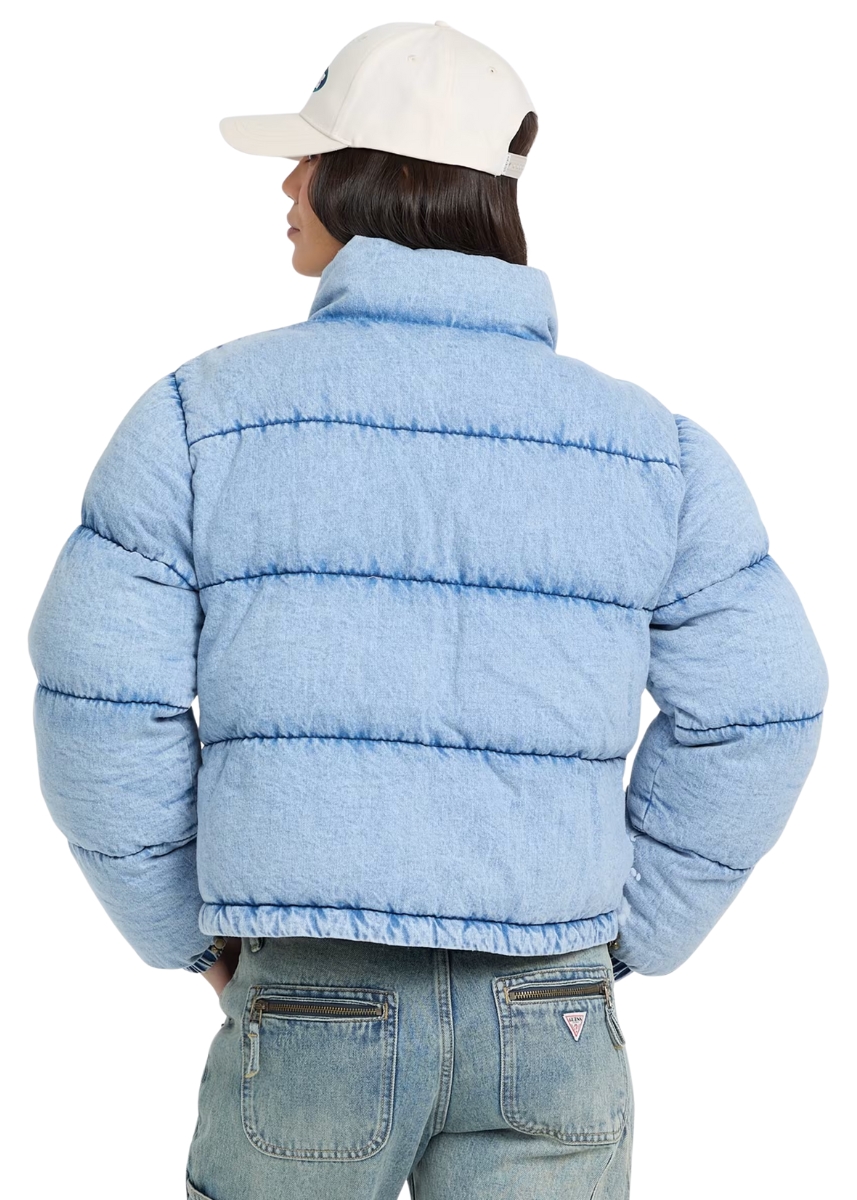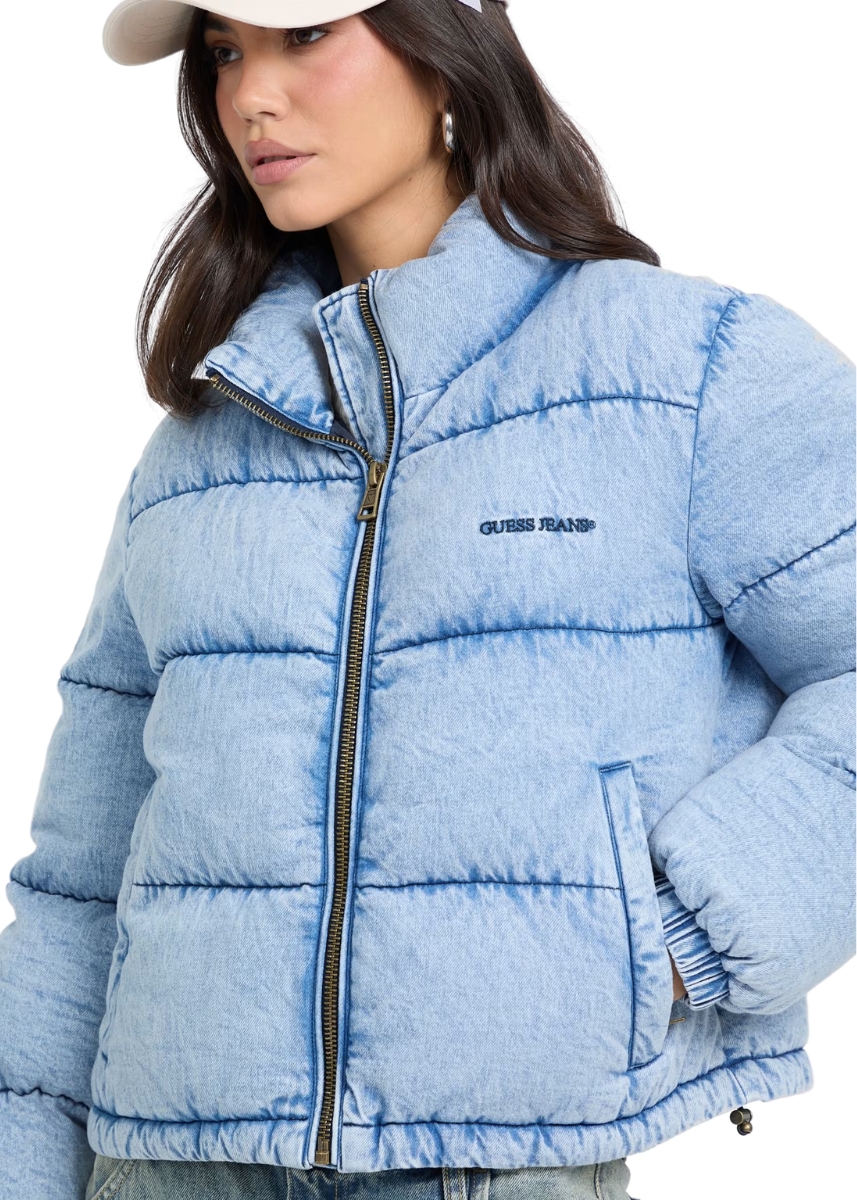 Γυναικείο φουσκωτό τζιν μπουφάν GUESS JEANS με όρθιο γιακά και logo στο στήθος.