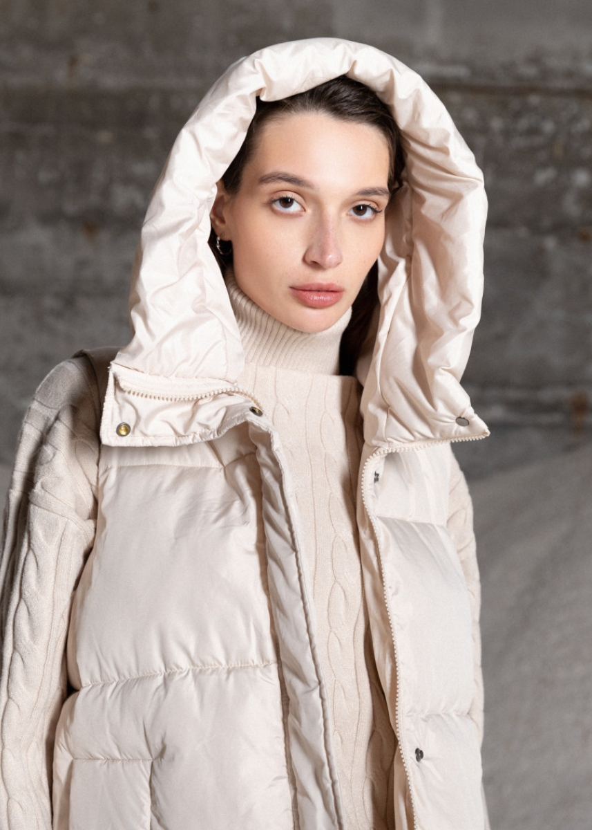 Γυναικείο Splendid μεσαίου μήκους αμάνικο μπουφάν με ενσωματωμένη κουκούλα. Κλείσιμο με κρυφό φερμουάρ και πατιλέτα με τρουκς.